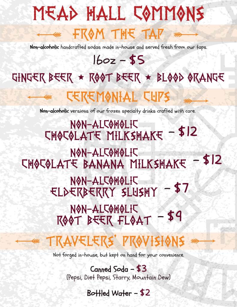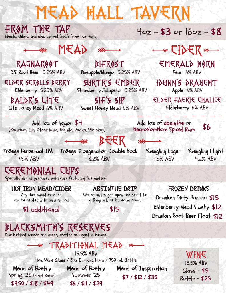 Join fellow adventurers at the Drunken Smithy Mead Hall where hearty mead flows, stories are shared, and legends are made. Immerse yourself in the spirit of the North as you enjoy locally crafted meads, ciders, and more. Whether you’re unwinding after a forging workshop or simply looking for a place to gather, the Mead Hall offers the perfect setting to raise a horn and unwind. Friday and Saturday evenings even feature live music to complete the experience. Skål!
