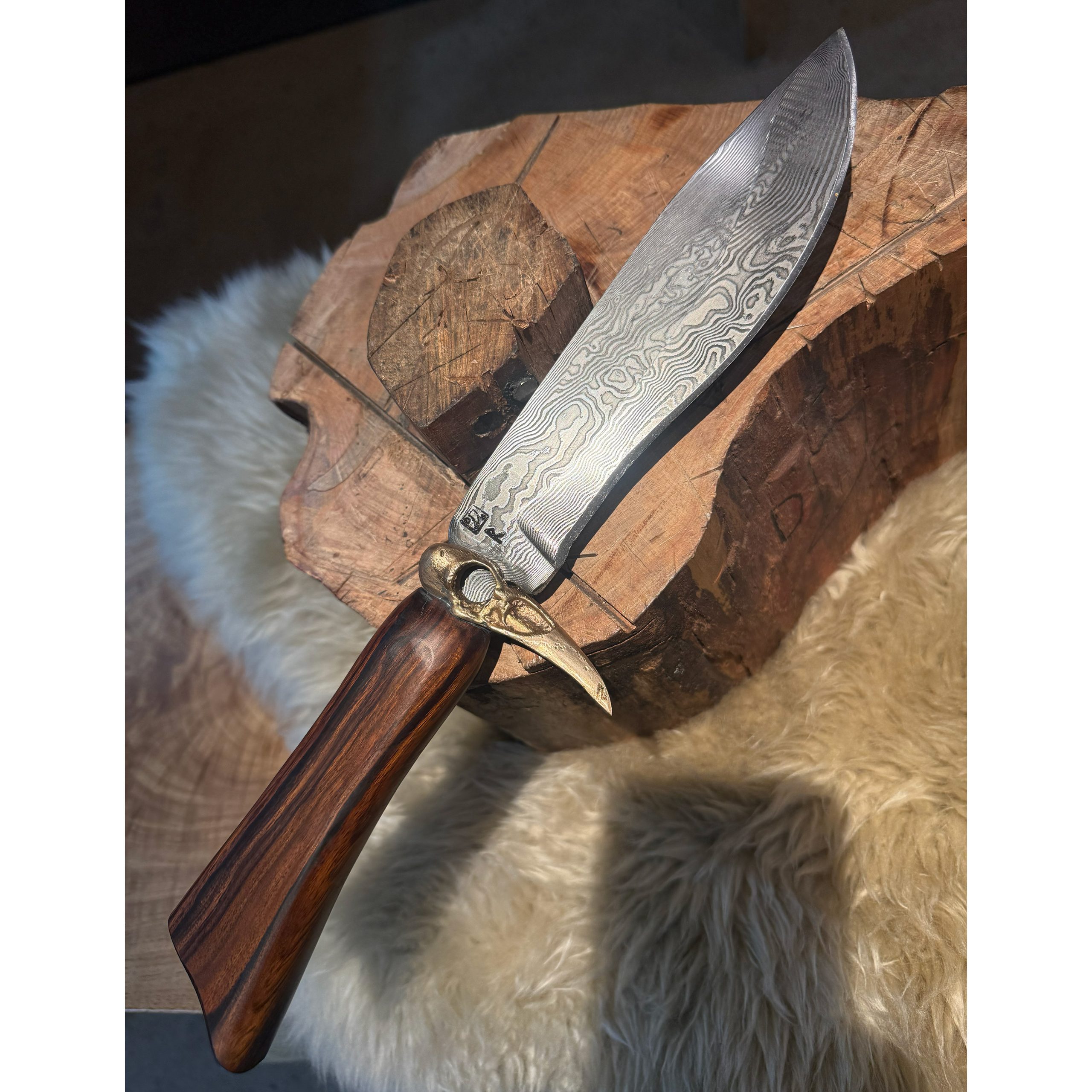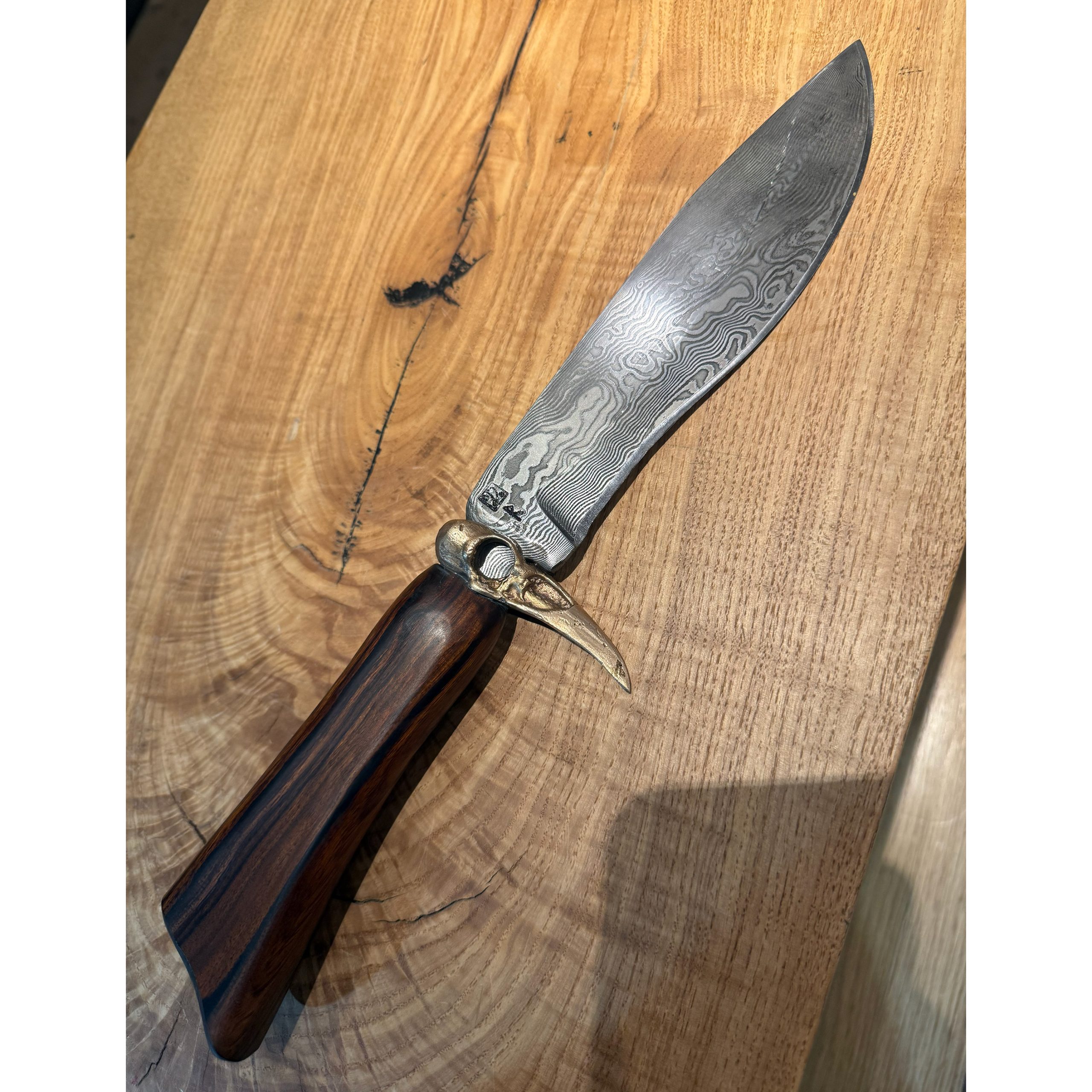 This knife is approximately 14 inches overall with a damascus steel blade just under 8 inches long. The bronze raven skull guard is 3 inches long. The handle is made from iron wood.
