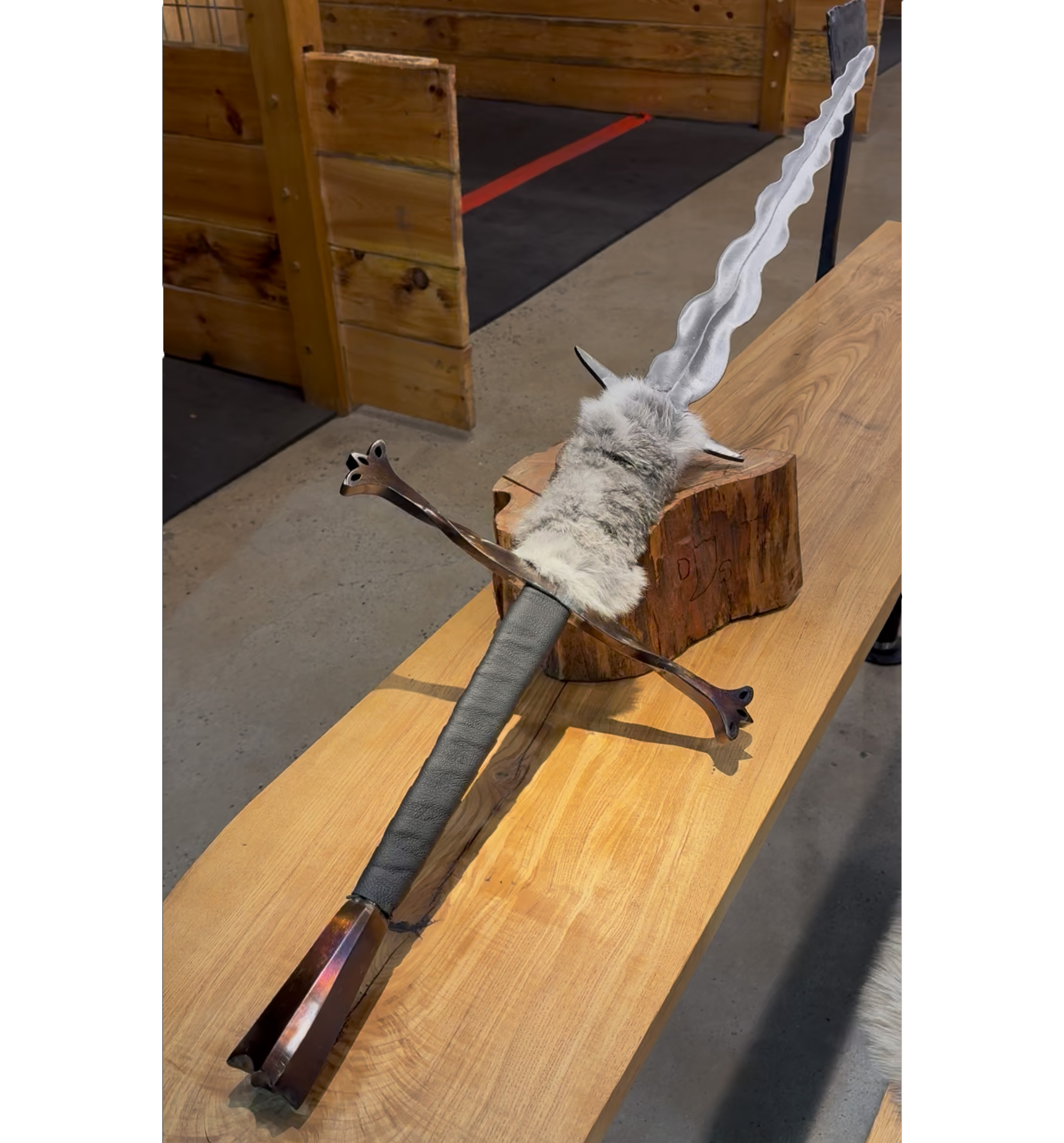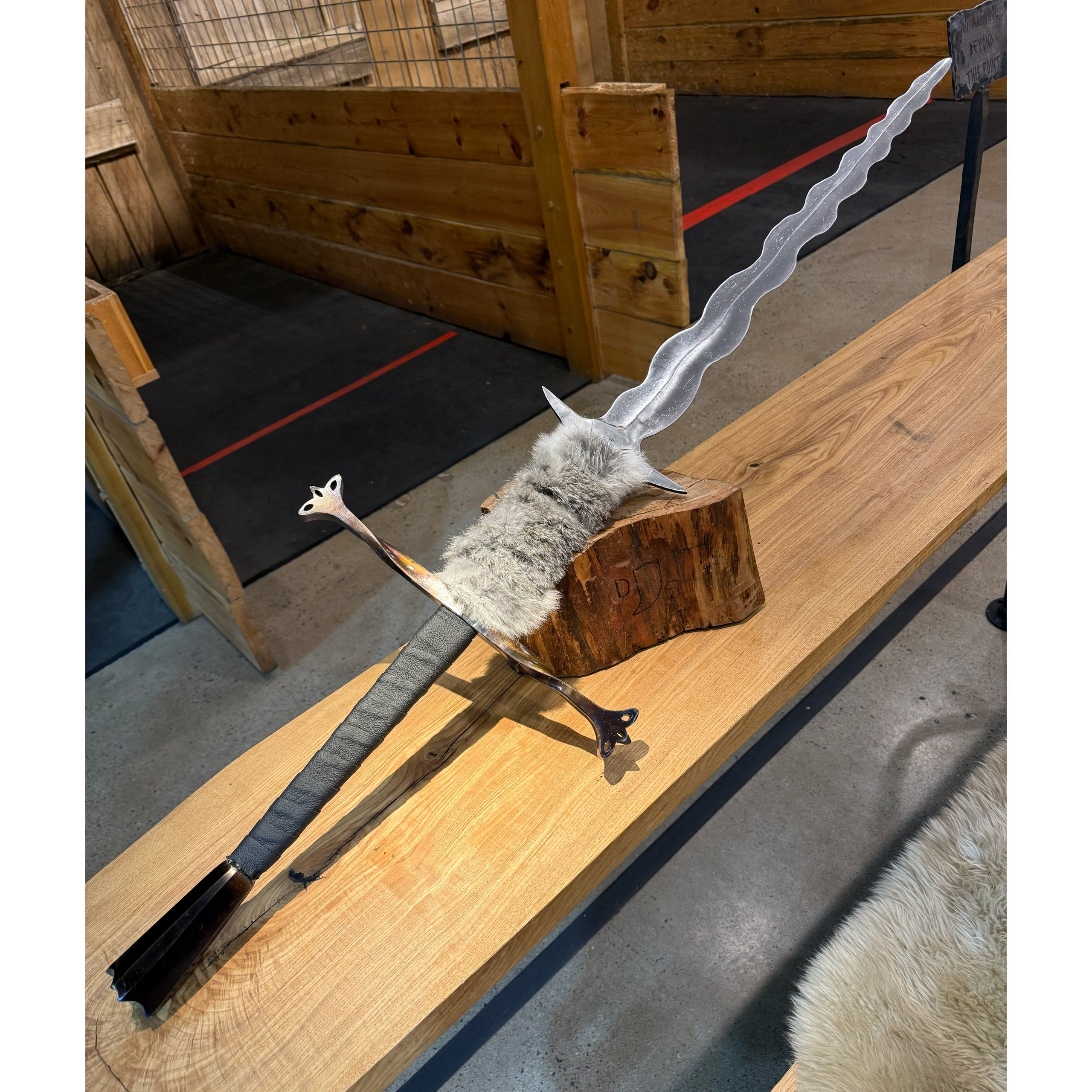 The ferocious flamberger is a two-handed flamberge with an 8.5 inch ricasso covered in rabbit fur. The pommel and the 16.25 inch guard have been beautifully blued. The blade has a stage combat edge (not sharp) and it is 29 inches long. The handle is 11.5 inches long and wrapped in leather. This sword has been heat treated and it is safe for use. Overall this sword is approximately 56.5 inches long from pommel to tip.